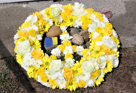 Einige junge Menschen hatten Steine mitgebracht und legten sie, sich der Symbolik bewusst, an den Gedenkstelen nieder. Wie hellwach junge Leute (12/13 Jahre) die Zeit wahrnehmen, zeigt auch ein mit ukrainischen Farben bemalter Stein.